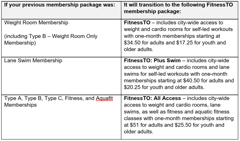 More information about the new FitnessTO membership options is available in the table below and on the City's website, here.